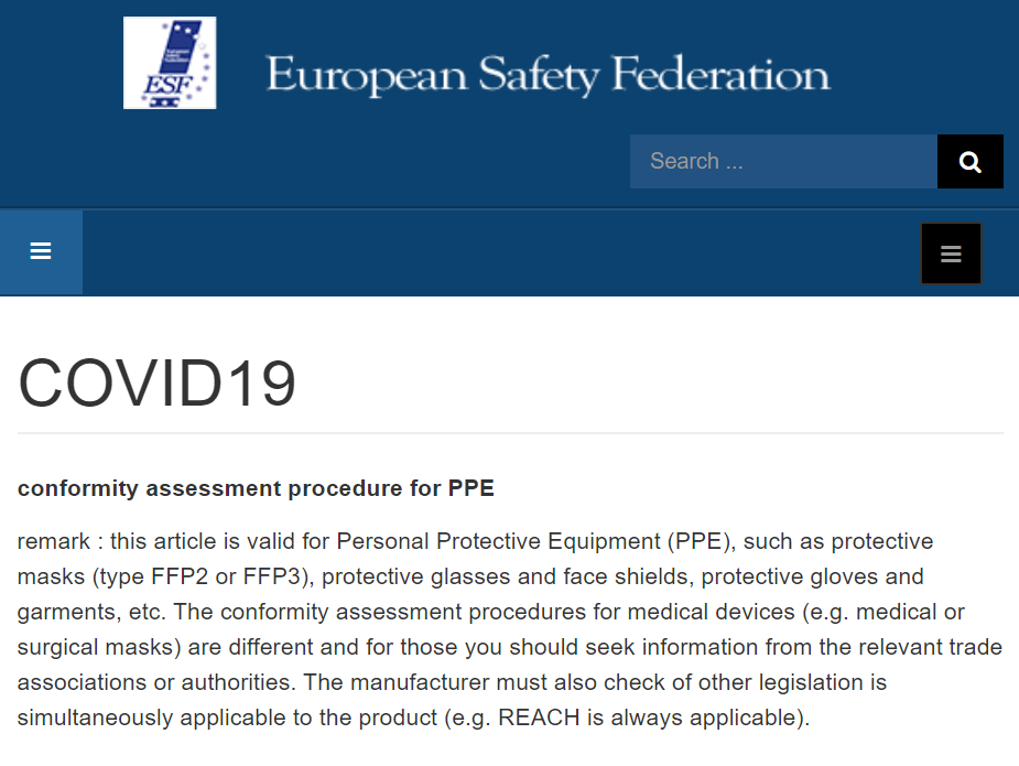 Recently, the European Safety Federation (European Safety Federation) published an article on its official website to \"fake\" the current CE certificates of some personal protective equipment (PPE). It also said that protective masks (FFP2 or FFP3 type), protective glasses and Personal protective equipment (PPE) such as face masks, protective gloves, and protective clothing must meet the REACH regulations in addition to the currently focused CE certification.